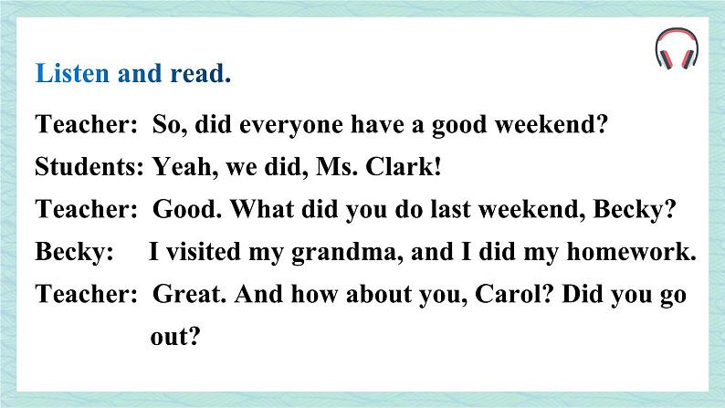 Carl: N, I stayed at hme. I studied fr the English test.Teacher: Ww, gd fr yu. Jack, hw abut yu? Where did yu g?Jack: I went t a farm, and I fed sme cws.Teacher: Sunds like yu had fun.