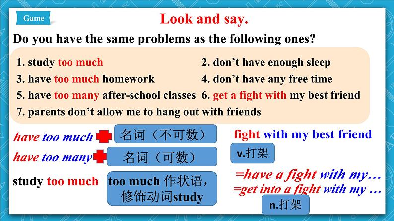 Unit 4 Why don't you talk to your parents?Period 1 SectionA 1a-2d 人教新目标版英语八年级下册Presentation1.掌握下列词汇:allow, wrong, What's wrong? guess, deal, look through, big deal, work out, get into a fight with sb. 掌握句型:I have too much homework so I don't have any free time to do things I like.My parents don't allow me to hang out with my frinds.Why don't you go to sleep earlier this eveningBut why don't you forget about it so that you can be friends again?2. 在听力活动中,能够通过选择句子,听力填空等听懂谈论青少年问题和建议的对话。4.能够谈论自身存在的问题困难,并就别人的困惑正确使用You could ….You should ….Why don't you...?句型给出建议。5. 主动与别人交流,采用正确的方式解决生活中的问题 。Listen and repeat.allow v.允许;准许wrong adj. 有毛病;错误的What’s wrong?哪儿不舒服?look through快速查看;浏览guess v. 猜测;估计deal n.协议;交易big deal重要的事work out 成功地发展;解决Do you have any problems in your daily life? Talk about your problems.Look and say.stay up late to study and don’t get enough sleephave too much homeworkhave too many after-school classeslaugh at me fight with classmatefail the examDo you have the same problems as the following ones? Look and say.1. study too much 2. don’t have enough sleep 3. have too much homework 4. don’t have any free time 5. have too many after-school classes 6. get a fight with my best friend7. parents don’t allow me to hang out with friends have too much homework名词(不可数)have too many after-school classes名词(可数)study too muchtoo much 作状语,修饰动词studyfight with my best friend=have a fight with my…=get into a fight with my …v.打架n.打架 GamePresentationLook and say.What’s the girl doing?She is taking piano lessons.\She is playing the piano.Is she happy?Yes, she is happy.a girlWhat’s the girl doing?She is doing her homework.\She is studying.Is she happy?No, she isn’t.problemsPresentationLook and say.Look at these problems. Do you think they are serious or not? Write them in the appropriate box.I have to study too much so I don’t get enough sleep.I have too much homework so I don’t have any free time to do things I like.My parents don’t allow me to hang out with my friends.I have too many after-school classes.I got into a fight with my best friend.1a1 2 53 4too much 太多, 修饰不可数名词too many 太多, 修饰复数名词much too 太,修饰 adj 或adv原形, 表程度The story is much too interesting.这个故事太有趣了。=have a fight with sb.=fight with sb.allow sb to do sth 允许某人做某事PresentationLook and say.Say out the problems according to the pictures.I have too much homework so I don't have any free time to do the things I like.My parents don't allow me to hang out with my friends.I have too many after-school classes.I got into a fight with my best friend.PresentationListen and circle.Listen and circle the problems you hear in 1a.Tip 1: Grasp the key words while listening1bI have to study too much so I don’t get enough sleep.I have too much homework so I don’t have any free time to do things I like.My parents don’t allow me to hang out with my friends.I have too many after-school classes.I got into a fight with my best friends.PresentationListen and fill.Listen and fill in the chart.1bgo to bed earlierstart studying earliertell your parentsdo so many thingsListen and fill.1bListen again and fill in the blanks.A: You look really tired. What’s _________?B: I studied _____midnight last night so I didn’t ____ enough sleep. A: _____________ go to sleep earlier tonight? You can start ________ earlier.B: But I have two after-school classes today. So I can only start studying after dinner.A: ______ you ______ tell your parents that you can’t do _______ things. B: I did, but I they think it’s _________ that I _____ more after-school classes.A: Well, they probably want you to ______ a good senior high school.B: Yes, I guess that’s the reason.A: You should talk to them again. ______ to them that you need to get enough sleep to ____________.B: That’s a ood idea. OK, I’ll try to talk to them again.the mattergetWhy don’t youstudyingMaybe shouldso manyuntilimportanttakeget intoExplain stay healthystart doing sth. 开始做某事PresentationListen and repeat.Girl1: You look really tired.What's the matter?Girl 2: I studied until midnight last night so I didn't get enough sleep.Girl1: Why don't you go to sleep :earlier tonight? You can start studying earhe.Girl 2: But I have two after-school classes today. So I can only start studying after dinner.Girl 1: Maybe you should tell your parents that you can’t do so many things.Girl 2: I did,but they think it's important that I take more after-school classesGirl1: Well, they probably want you to get into a good senior high schoolGirl·2: Yes,I guess that's the reason.Girl 1: You should talk to them agan.Explain to them that you need to get enough sleep to stay healthy.Girl 2: That's a good idea. OK, I'll try to talk ·to them again.ProblemsadvicePresentationAsk and answer.Look at the problems in 1a and make conversations.1cA: What’s wrong, Eric?B: I’m tired because I studied until midnight last night.A: Why don’t you go to sleep earlier this evening?problemsadvicePresentationAsk and answer.A: What’s wrong? / What’s the matter?B: ….A: Why don’t you…? Why not…? You could/should….Problems:I’m very shy.My parents always argue.I’m nervous.….Advice:Make new friendsTalk to themListen to music….×If others give you advice, what should you do?A: Accept all the adviceB: Choose the proper(合适的) advice.PresentationListen and fill.Listen and fill in the blanks.What’s Peter’s problem?PeterBoy1: Hey, Peter, What’s the matter?B: I ___________with my best friend. What should I do?had a fight … …advicePresentationListen and fill.2aListen