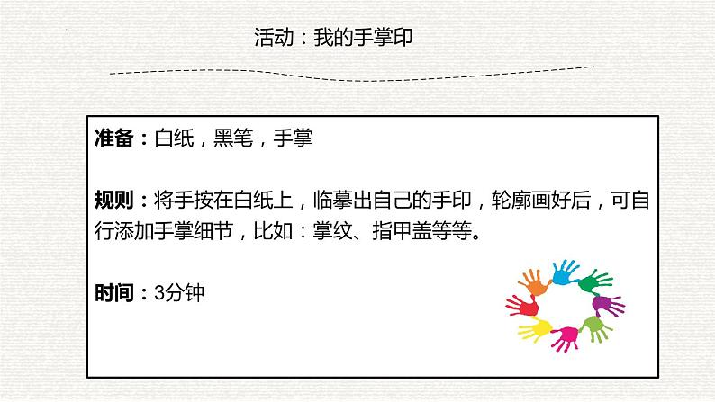 准备:白纸,黑笔,手掌规则:将手按在白纸上,临摹出自己的手印,轮廓画好后,可自行添加手掌细节,比如:掌纹、指甲盖等等。时间:3分钟
