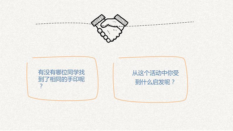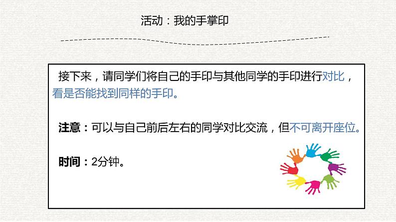 接下来,请同学们将自己的手印与其他同学的手印进行对比,看是否能找到同样的手印。 注意:可以与自己前后左右的同学对比交流,但不可离开座位。 时间:2分钟。