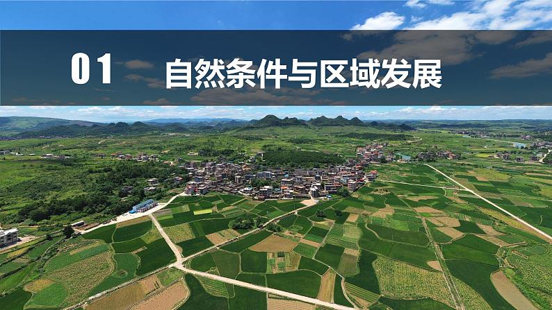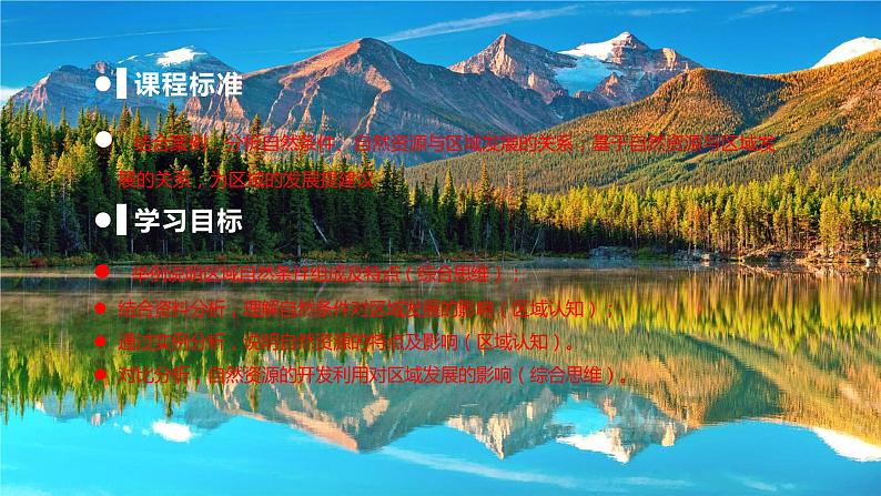 展开▋课程标准 结合案例,分析自然条件、自然资源与区域发展的关系;基于自然资源与区域发展的关系,为区域的发展提建议▋学习目标 举例说明区域自然条件组成及特点(综合思维);结合资料分析,理解自然条件对区域发展的影响(区域认知);通过实例分析,说明自然资源的特点及影响(区域认知)。对比分析,自然资源的开发利用对区域发展的影响(综合思维)。