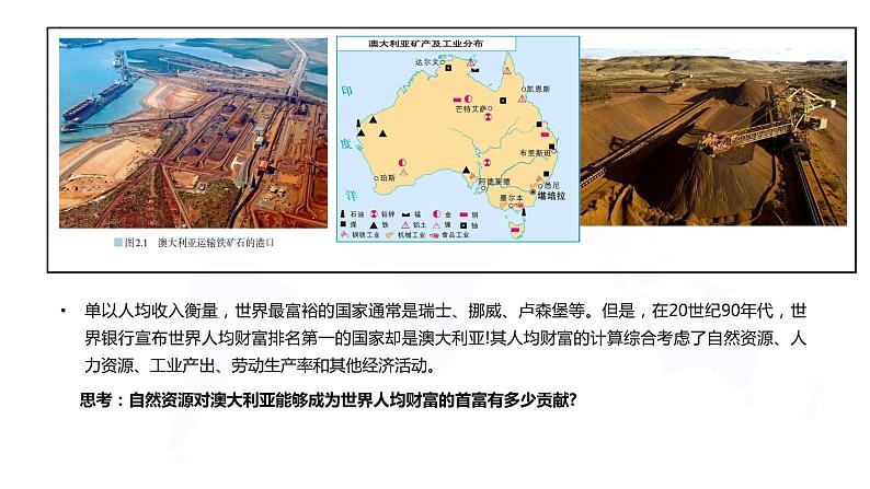 单以人均收入衡量,世界最富裕的国家通常是瑞士、挪威、卢森堡等。但是,在20世纪90年代,世界银行宣布世界人均财富排名第一的国家却是澳大利亚!其人均财富的计算综合考虑了自然资源、人力资源、工业产出、劳动生产率和其他经济活动。 思考:自然资源对澳大利亚能够成为世界人均财富的首富有多少贡献?
