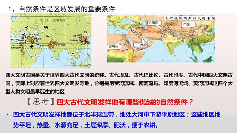 四大古代文明发祥地都位于北半球温带,地处大河中下游平原地区;这些地区地势平坦,热量、水源充足,土层深厚、肥沃,便于农耕。