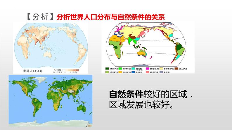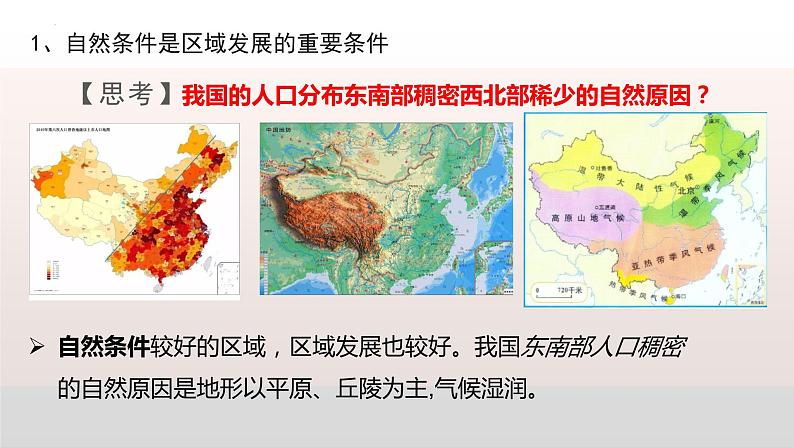 自然条件较好的区域,区域发展也较好。我国东南部人口稠密的自然原因是地形以平原、丘陵为主,气候湿润。