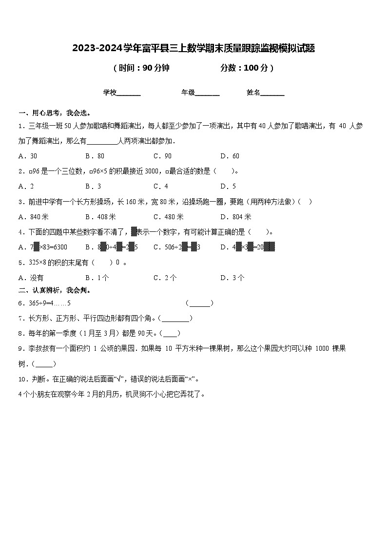 2023-2024学年富平县三上数学期末质量跟踪监视模拟试题含答案