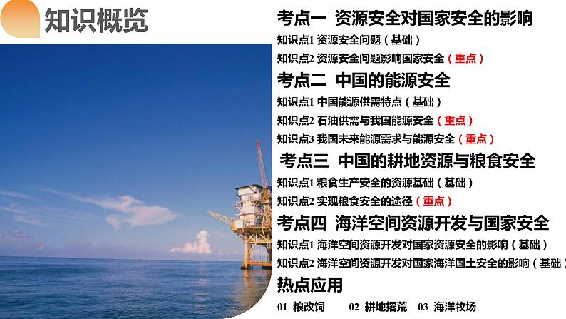 考点一 资源安全对国家安全的影响知识点1 资源安全问题(基础)知识点2 资源安全问题影响国家安全(重点)考点二 中国的能源安全知识点1 中国能源供需特点(基础)知识点2 石油供需与我国能源安全(重点)知识点3 我国未来能源需求与能源安全(重点) 考点三 中国的耕地资源与粮食安全知识点1 粮食生产安全的资源基础(基础)知识点2 实现粮食安全的途径(重点)考点四 海洋空间资源开发与国家安全知识点1 海洋空间资源开发对国家资源安全的影响(基础)知识点2 海洋空间资源开发对国家海洋国土安全的影响(基础)热点应用01 粮改饲 02 耕地撂荒 03 海洋牧场