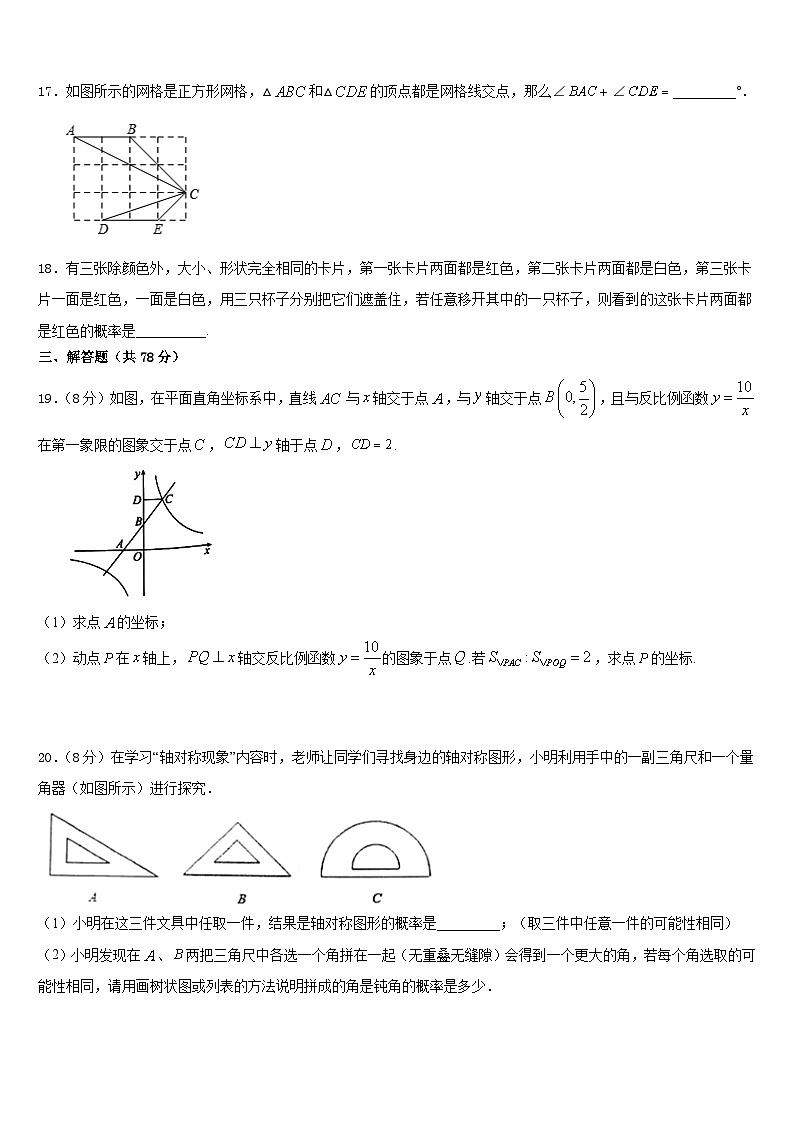 20.(8分)在学习“轴对称现象”内容时,老师让同学们寻找身边的轴对称图形,小明利用手中的一副三角尺和一个量角器(如图所示)进行探究.