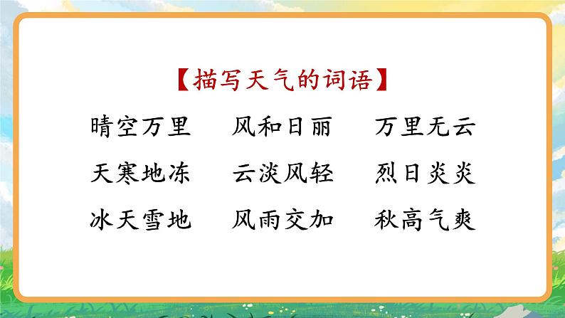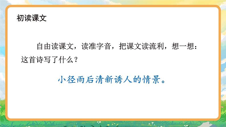 展开12* 在晴了的时候部编版小学语文四年级下册【描写天气的词语】晴空万里 风和日丽 万里无云天寒地冻 云淡风轻 烈日炎炎冰天雪地 风雨交加 秋高气爽 戴望舒(1905—1950),浙江杭州人,现代诗人。1928年《雨巷》一诗的发表引起轰动,因此他又被称为“雨巷诗人”。 主要作品:《雨巷》《狱中题壁》《我用残损的手掌》,诗集《望舒草》《望舒诗稿》等。作者简介 自由读课文,读准字音,把课文读流利,想一想:这首诗写了什么?初读课文小径雨后清新诱人的情景。我会认我会读炫耀 尘垢 胆怯 曝晒赤脚 涉水 晕皱多音字晕yūn (头晕)(晕倒) yùn(红晕)(晕车)(晕船)曝pù (曝阳)(曝晒)(一曝十寒)bào(曝光)(自曝)字义:瘦字义:显露表示昏迷,头脑不清太阳、月亮形成的光圈或模糊影像。连一连炫耀胆怯尘垢晕皱闲游形容水的表面起波澜。夸耀。悠闲地游玩。胆小,缺少勇气。灰尘和污垢。 有感情地朗读课文,思考:这首诗是按什么顺序来写的?再读课文雨后小径 走入小径放眼望去走入小径放眼望去雨后小径在天晴了的时候,请到小径中去走走: 开篇点题。以亲切、平和的话语,自然地将我们的思绪引向那清新润泽的郊外小径。读一读诗的前两句,说一说:诗人在召唤我们做什么? 读一读第1小节的剩余部分,找一找诗中描写了哪些雨过天晴的景物? _____、_____、_______、_______这四种平凡而又美丽的事物。泥路小草小白菊凤蝶儿给雨润过的泥路,一定是凉爽又温柔;展现了雨后小径的清新。炫耀着新绿的小草,一下子洗净了尘垢; 小草像孩子一样炫耀着新绿,读来使人倍感亲切。炫耀洗净拟人不再胆怯的小白菊,慢慢地抬起它们的头,试试寒,试试暖,然后一瓣瓣地绽透;“透”字让你仿佛看到了怎样的景象? 我仿佛看到了小白菊努力绽开每一片花瓣,极致灿烂的景象。 小白菊被赋予了生命的灵性,虽娇小、羞怯,但在雨后初晴中勇敢地绽放出了自己最美的一面。诗人笔下的小白菊是个怎样的形象?抖去水珠的凤蝶儿,在木叶间自在闲游,把它五彩的智慧书页,曝着阳光一开一收。翅膀五彩的智慧书页比作 想象奇特,生动而形象,把我们带到了一个奇光异彩的世界。走入小径放眼望去雨后小径到小径中去走走吧,在天晴了的时候:赤着脚,携着手,踏着新泥,涉过溪流。赤着脚,携着手,踏着新泥,涉过溪流。 表现了全身心投入大自然,亲密接触大自然,与大自然和谐相伴的无限美好。诗人再次发出召唤。走入小径放眼望去雨后小径新阳推开了阴霾了,溪水在温风中晕皱,看山间移动的暗绿——云的脚迹——它也在闲游。新阳溪水云一切都是那么清新、舒适。 我们在诗人笔下的大自然中徜徉,仿佛也感受到了大自然那博大的情怀和浓浓的爱意。朗读这首诗,你发现诗人笔下的景物有怎样的特点? 诗人笔下的一事一物都是鲜活的、有生命的。泥路、小白菊,还有“炫耀着新绿的小草”“抖去水珠的凤蝶儿”等,都让我们感受到一个个鲜活的生命的存在。结构梳理特写镜头热爱自然亲近自然在天晴了的时候行动起来放眼望去泥路:凉爽温柔赤脚 携手 踏泥 涉溪小草:炫耀新绿白菊:花瓣绽透凤蝶:自在闲游新阳:推开溪水:晕皱云:闲游 这是一首生动活泼、情趣盎然的小诗,诗人用清新优美的语言描绘了小径雨后的诱人情景,表达了诗人亲近自然、热爱生活的情感。主旨概括 雨后的景色多么迷人。漫步在雨后的小路上,该是多么令人陶醉的事情啊!让我们在学习之余,走进大自然的怀抱,感受大自然的美好吧!感悟心语山居秋暝(节选)[唐]王维空山新雨后,天气晚来秋。明月松间照,清泉石上流。拓展延伸 【译文】新雨过后山谷里空旷清新,初秋傍晚的天气特别凉爽。明月映照着幽静的松林,清澈的泉水在山石上淙淙流淌。雨巷(节选)戴望舒撑着油纸伞,独自彷徨在悠长、悠长又寂寥的雨巷,我希望逢着一个丁香一样的结着愁怨的姑娘。 1.试想一下,如果你也走在这样一条小径,会有哪些感受呢?写下来与同学交流。 2.搜集其他描写大自然美景的诗句,细心品读。课后作业下 课 啦
