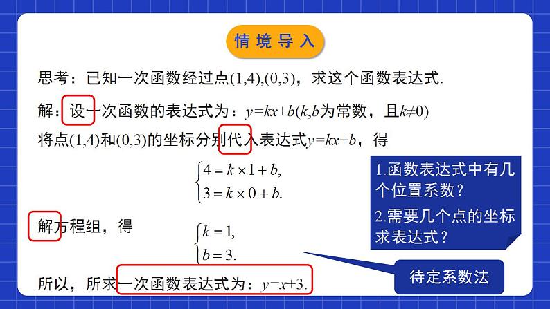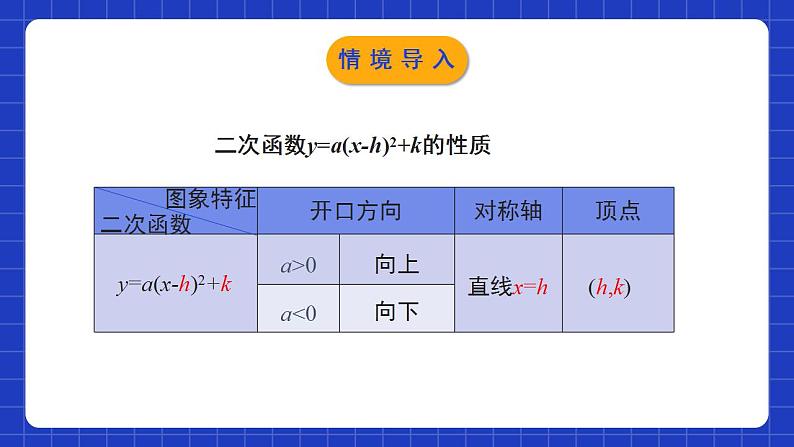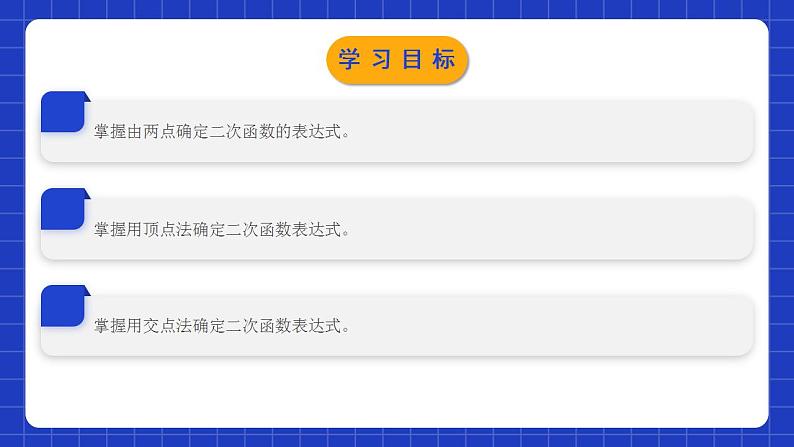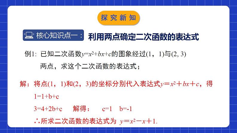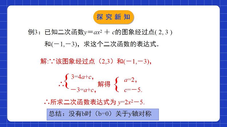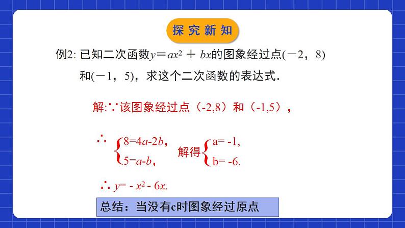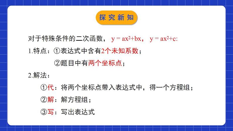 2.3.1确定二次函数的表达式第1课时学习目标掌握用交点法确定二次函数表达式。掌握由两点确定二次函数的表达式。掌握用顶点法确定二次函数表达式。向上向下直线x=h(h,k)二次函数图象特征二次函数y=a(x-h)2+k的性质y=a(x-h)2+k情境导入思考:已知一次函数经过点(1,4),(0,3),求这个函数表达式.待定系数法1.函数表达式中有几个位置系数?2.需要几个点的坐标求表达式?情境导入利用两点确定二次函数的表达式例1: 已知二次函数y=x2+bx+c的图象经过(1,1)与(2, 3) 两点,求这个二次函数的表达式;将点(1,1)和(2,3)的坐标分别代入表达式y=x2+bx+c,得1=1+b+c3=4+2b+c 解得: c=1 b=-1∴所求二次函数的表达式为 y=x2-x+1.解:探究新知对于特殊条件的二次函数, y = ax2+bx, y = ax2+c:1.特点:①表达式中含有2个未知系数; ②题目中有两个坐标点;2.解法:①代:将两个坐标点带入表达式中,得一个方程组;②解:解方程组;③写:写出表达式探究新知 例2: 已知二次函数y=ax2 + bx的图象经过点(-2,8) 和(-1,5),求这个二次函数的表达式. 解:∵该图象经过点(-2,8)和(-1,5),解得∴ y= - x2 - 6x.{{a= -1,b= -6.总结:当没有c时图象经过原点探究新知∴例3:已知二次函数y=ax2 + c的图象经过点( 2, 3 ) 和(-1,-3),求这个二次函数的表达式. 解:∵该图象经过点(2,3)和(-1,-3), 3=4a+c,-3=a+c,∴所求二次函数表达式为 y=2x2-5.a=2,c=-5.解得{总结:没有b时(b=0)关于y轴对称{探究新知顶点法求二次函数的表达式例4: 已知抛物线的顶点坐标为(4,-1),与y轴交于点(0,3)求这条抛物线的表达式.探究新知解:依题意设y=a(x-h)2+k ,将顶点(4,-1)及交点(0,3)代入得3=a(0-4)2-1,解得a= , ∴这条抛物线的表达式为:y= (x-4)2-1.探究新知归纳总结顶点法求二次函数的方法这种知道抛物线的顶点坐标,求表达式的方法叫做顶点法.其步骤是:①设函数表达式是y=a(x-h)2+k;②先代入顶点坐标,得到关于a的一元一次方程;③将另一点的坐标代入原方程求出a值;④a用数值换掉,写出函数表达式.探究新知交点法求二次函数的表达式例5:选取(-3,0),(-1,0),(0,-3),试求出这个二次函数的表达式. 探究新知 解: ∵(-3,0)(-1,0)是抛物线y=ax2+bx+c与x轴的交点.所以可设这个二次函数的表达式是y=a(x-x1)(x-x2).(其中x1、x2为交点的横坐标.因此得y=a(x+3)(x+1).再把点(0,-3)代入上式得a(0+3)(0+1)=-3,解得a=-1,∴所求的二次函数的表达式是 y=-(x+3)(x+1),即y=-x2-4x-3.探究新知交点法求二次函数表达式的方法这种知道抛物线与x轴的交点,求表达式的方法叫做交点法.其步骤是:①设函数表达式是y=a(x-x1)(x-x2);②先把两交点的横坐标x1,x2代入到表达式中,得到关于a的一元一次方程;③将另一点的坐标代入原方程求出a值;④a用数值换掉,写出函数表达式.归纳总结探究新知 在什么情况下,一个二次函数只知道其中两点就可以确定它的表达式?1.用顶点式y=a(x-h)2+k时,知道顶点(h,k)和图象上的另一点坐标,就可以确定这个二次函数的表达式。2. 用一般式y=ax²+bx+c确定二次函数时,如果系数a,b,c中有两个是未知的,知道图象上两个点的坐标,也可以确定这个二次函数的关系式.探究新知 在什么情况下,一个二次函数只知道其中两点就可以确定它的表达式?3.用交点式y=a(x-x1)(x-x2)时,抛物线与x轴交点的横坐标x1,x2,就可以确定这个二次函数的表达式。探究新知 1. 若抛物线y=x2-8x+m的顶点在x轴上,则m=( ) A. -16 B. 16 C. -4 D. 8 2. 形状与抛物线y=-x2-2相同,对称轴是直线x=-2,且过点(0,3)的抛物线是( ) A. y=x2+4x+3 B. y=-x2-4x+3 C. y=-x2+4x+3 D. y=x2+4x+3或y=-x2-4x+3BD随堂练习3. 如图,平面直角坐标系中,函数图象的表达式应是 .4.过点(2,4),且当x=1时,y有最值为6,则其表达式是 .y=-2(x-1)2+6随堂练习 5. 抛物线的顶点为(1,-4),与y轴交于点(0,-3),求该抛物线的函数表达式. 解:设抛物线的表达式为y=a(x-1)2-4. 将(0,-3)代入y=a(x-1)2-4,得-3=a(0-1)2-4. 解得a=1. 所以抛物线的表达式为y=(x-1)2-4=x2-2x-3.随堂练习 6. 若二次函数y=ax2+4ax+c的最大值为4,且图象过点(-3,0),求二次函数的表达式. 随堂练习 解:∵该图象经过点(2,0)和(0,-6), 随堂练习(2)设该二次函数的对称轴与x轴交于点C,连接BA,BC,求△ABC的积.解:∵二次函数对称轴为∴c点坐标为(4,0)随堂练习用待定系数法求二次函数的解析式“顶点式”法已知任意一个点和顶点的坐标,设二次函数的表达式为y=a(x-h)2+k“交点式”法已知任意一个点和抛物线与x轴的两个交点(x1,0)(x2,0)的坐标,设二次函数的表达式为y=a(x-x1)(x-x2)课堂小结课程结束