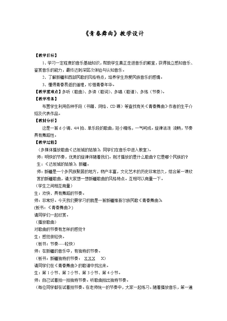 师:非常好。今天我们要学习的就是一首新疆维吾尔族民歌《青春舞曲》。