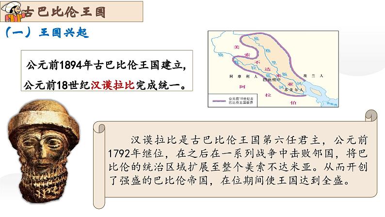 公元前1894年古巴比伦王国建立,公元前18世纪汉谟拉比完成统一。