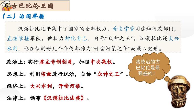 汉谟拉比几乎集中了国家的全部权力,亲自掌管司法和行政部门,直接掌握军队。他极力神化自己,自称“众神之王”。汉谟拉比还大兴水利,他在位的好几个年份都作为“开凿河渠之年”而载入史册。