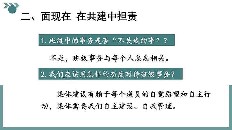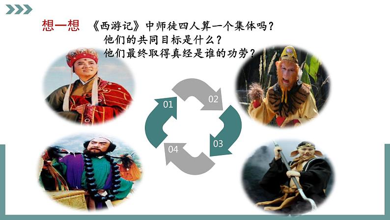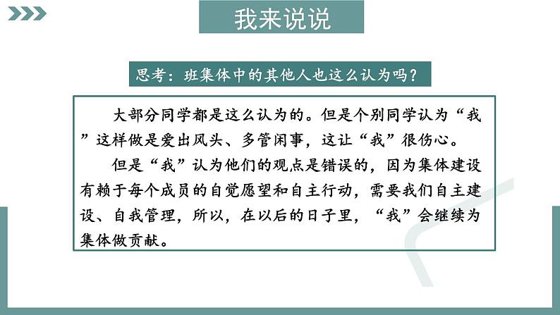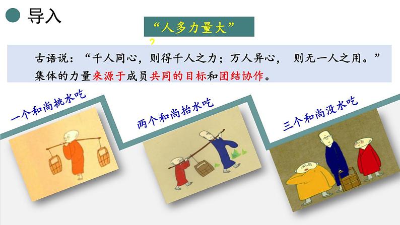这是一份人教部编版七年级下册第三单元 在集体中成长第八课 美好集体有我在我与集体共成长评课ppt课件,共22页。PPT课件主要包含了导入新课,运用你的经验,探究新知,一个和尚挑水吃,两个和尚抬水吃,三个和尚没水吃,想一想,探究与分享,材料展示,勇于担责的表现等内容,欢迎下载使用。