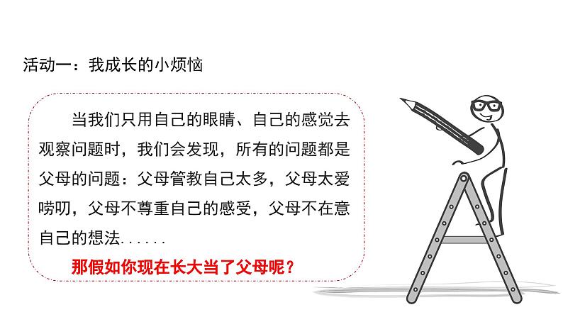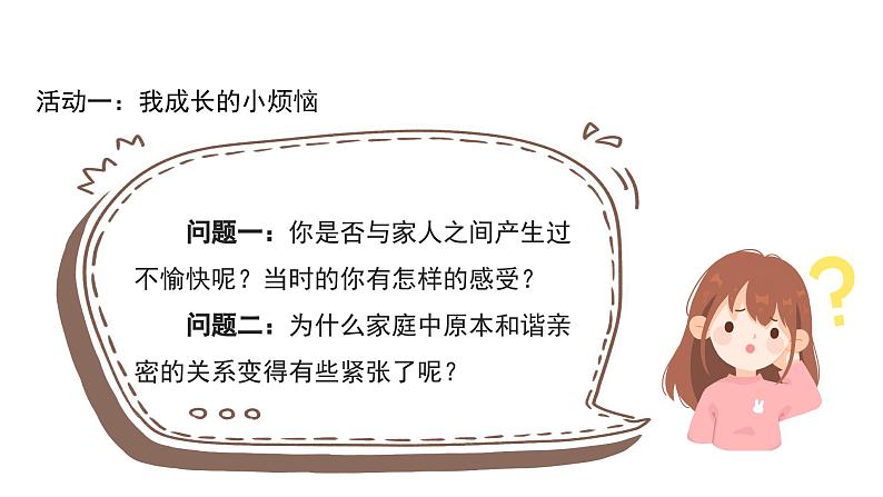 问题一:你是否与家人之间产生过不愉快呢?当时的你有怎样的感受?问题二:为什么家庭中原本和谐亲密的关系变得有些紧张了呢?