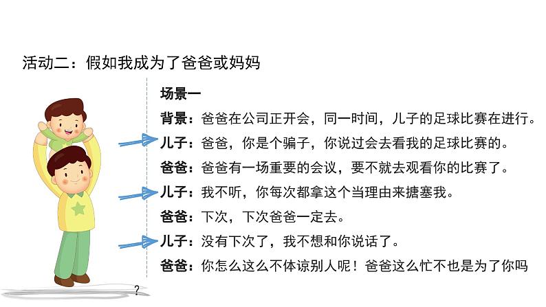 场景一背景:爸爸在公司正开会,同一时间,儿子的足球比赛在进行。儿子:爸爸,你是个骗子,你说过会去看我的足球比赛的。爸爸:爸爸有一场重要的会议,要不就去观看你的比赛了。儿子:我不听,你每次都拿这个当理由来搪塞我。爸爸:下次,下次爸爸一定去。儿子:没有下次了,我不想和你说话了。爸爸:你怎么这么不体谅别人呢!爸爸这么忙不也是为了你吗?儿子:我不想听,你别说了!