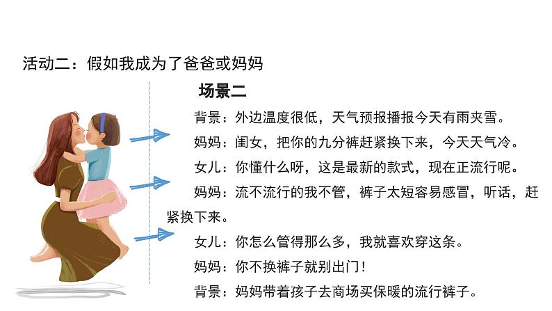 场景二背景:外边温度很低,天气预报播报今天有雨夹雪。妈妈:闺女,把你的九分裤赶紧换下来,今天天气冷。女儿:你懂什么呀,这是最新的款式,现在正流行呢。妈妈:流不流行的我不管,裤子太短容易感冒,听话,赶紧换下来。女儿:你怎么管得那么多,我就喜欢穿这条。妈妈:你不换裤子就别出门!背景:妈妈带着孩子去商场买保暖的流行裤子。