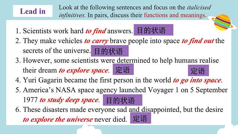 展开Lk at the fllwing sentences and fcus n the italicised infinitives. In pairs, discuss their functins and meanings.