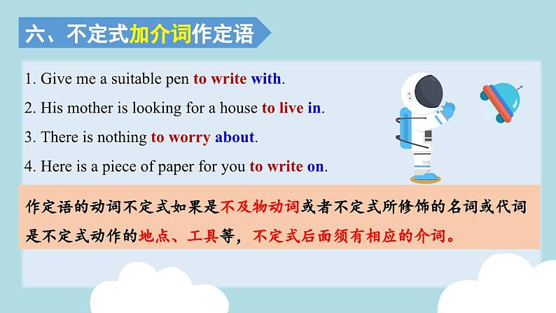 作定语的动词不定式如果是不及物动词或者不定式所修饰的名词或代词是不定式动作的地点、工具等,不定式后面须有相应的介词。