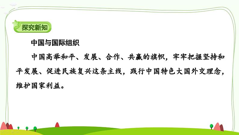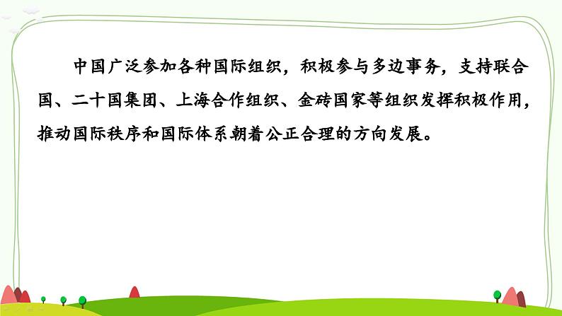 通过本节课的学习,我们了解了我国广泛地参加各种国际组织并发挥积极的作用。国际组织成为我国倡导构建人类命运共同体,促进全球治理体系变革的重要场所。我国在国际事务中的影响日益增强。中国始终高举和平、发展、合作、共赢的旗帜,牢牢把握坚持和平发展、促进民族复兴这条主线,践行中国特色大国外交理念,积极维护国家利益,为世界和平与发展承担着大国责任。