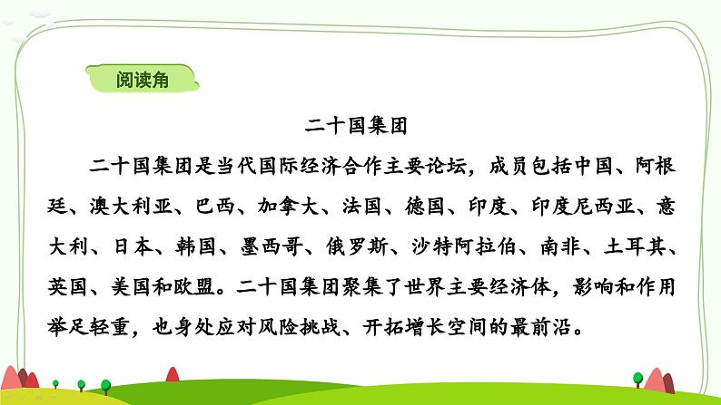 二十国集团 二十国集团是当代国际经济合作主要论坛,成员包括中国、阿根廷、澳大利亚、巴西、加拿大、法国、德国、印度、印度尼西亚、意大利、日本、韩国、墨西哥、俄罗斯、沙特阿拉伯、南非、土耳其、英国、美国和欧盟。二十国集团聚集了世界主要经济体,影响和作用举足轻重,也身处应对风险挑战、开拓增长空间的最前沿。