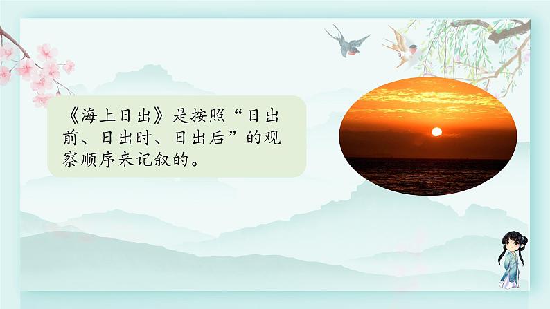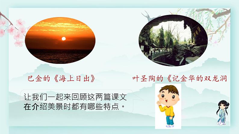语 文· 四年级(下册)·人教交流实践与习作第一课时巴金的《海上日出》叶圣陶的《记金华的双龙洞》《记金华的双龙洞》中还有一条线索,即作者多次写到水。在途中是“一路迎着溪流”;来到洞口时,发现“那溪流就是从洞里出来的”;“在外洞找泉水的来路,原来从靠左边的石壁下方的孔隙流出”;在内洞,作者看到泉水靠着右边缓缓地流”,听到“声音轻轻的”。《海上日出》描绘了晴朗天气时的日出和有云时的日出两种景象,而有云时又重点描写了云层厚时的景象。星期天,你要带一位同学参观植物园根据下面的示意图,画出参观路线,再按顺序说一说。用一段话按顺序介绍植物园。