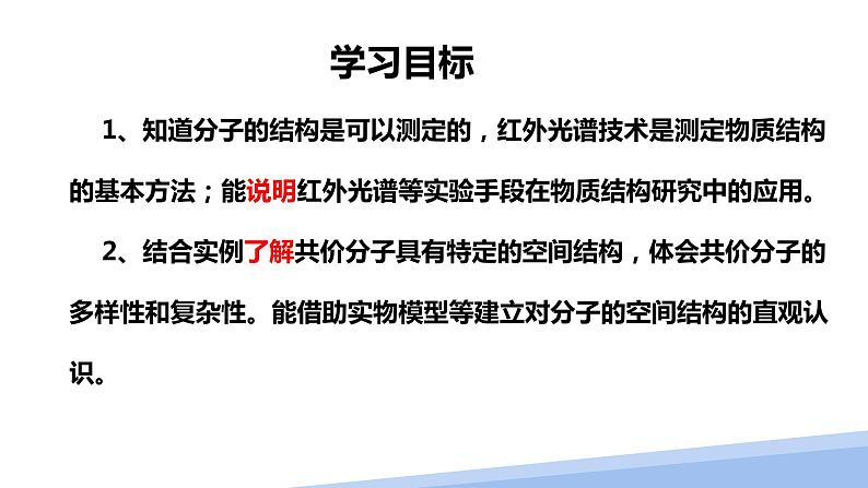 1、知道分子的结构是可以测定的,红外光谱技术是测定物质结构的基本方法;能说明红外光谱等实验手段在物质结构研究中的应用。2、结合实例了解共价分子具有特定的空间结构,体会共价分子的多样性和复杂性。能借助实物模型等建立对分子的空间结构的直观认识。