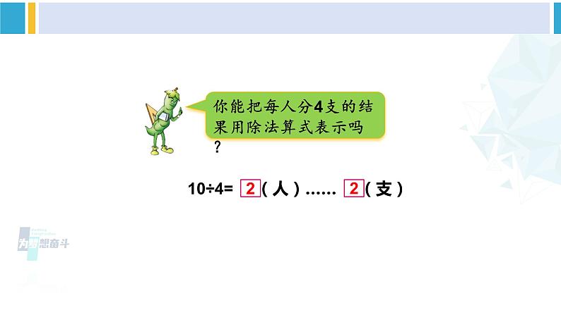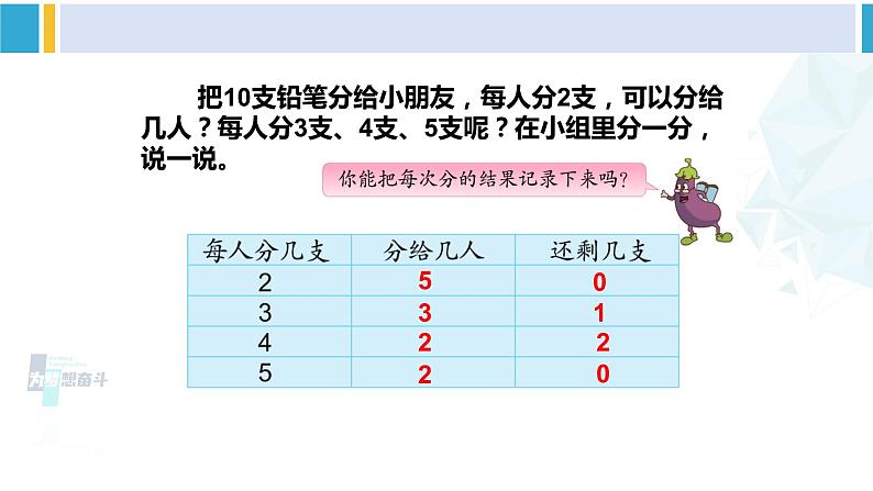 展开把10支铅笔分给小朋友,每人分2支,可以分给几人?在小组里分一分,说一说。