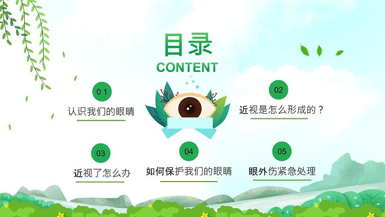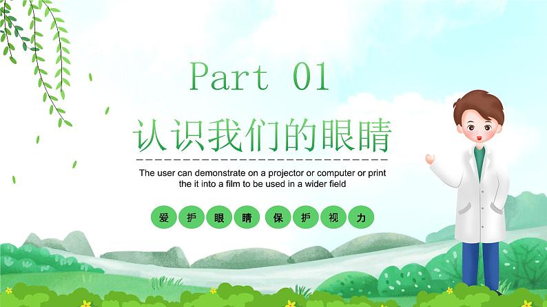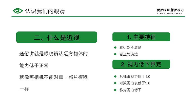 小学班会 健康教育主题班会-------爱眼护眼预防近视知识学习 课件: 这是一份小学班会 健康教育主题班会-------爱眼护眼预防近视知识学习 课件,共26页。PPT课件主要包含了第一部分,关于我们的眼睛,第二部分,什么是近视,认识近视,第三部分,影响近视的因素,遗传因素,环境因素,营养因素等内容,欢迎下载使用。