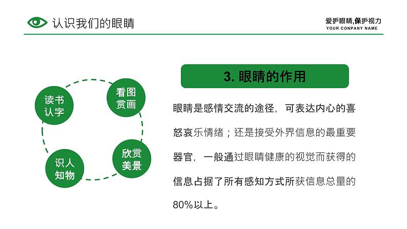眼睛是感情交流的途径,可表达内心的喜怒哀乐情绪;还是接受外界信息的最重要器官,一般通过眼睛健康的视觉而获得的信息占据了所有感知方式所获信息总量的80%以上。