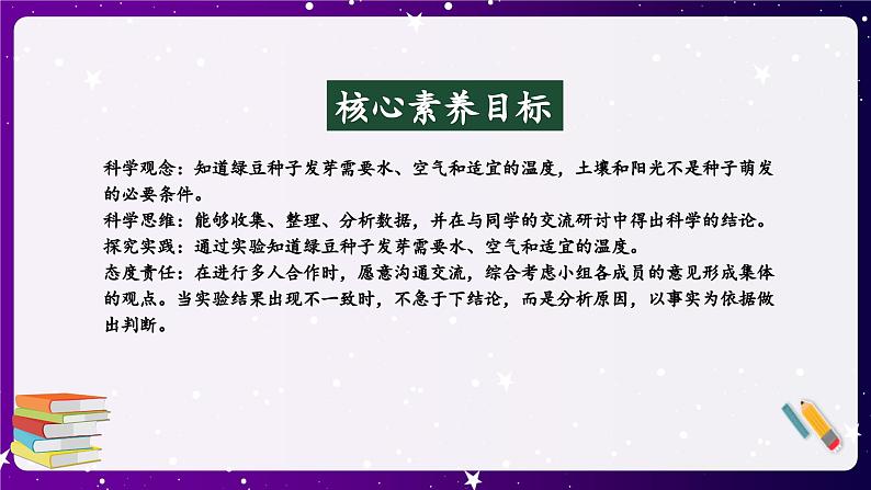 科学观念:知道绿豆种子发芽需要水、空气和适宜的温度,土壤和阳光不是种子萌发的必要条件。科学思维:能够收集、整理、分析数据,并在与同学的交流研讨中得出科学的结论。探究实践:通过实验知道绿豆种子发芽需要水、空气和适宜的温度。态度责任:在进行多人合作时,愿意沟通交流,综合考虑小组各成员的意见形成集体的观点。当实验结果出现不一致时,不急于下结论,而是分析原因,以事实为依据做出判断。