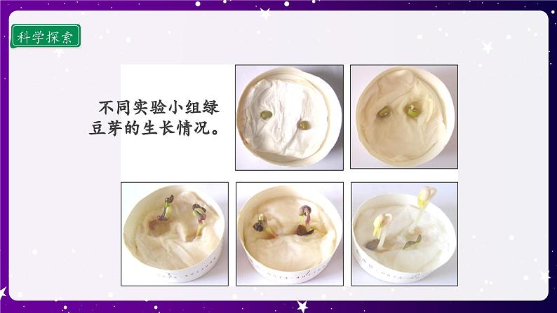 集体思考:(1)实验带给我们的信息有哪些?(2)实验结果和实验前的猜测是否一致?说明了什么?(3)绿豆发芽必需的条件是什么?