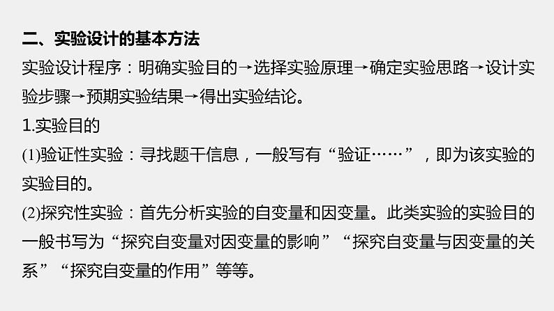 二、实验设计的基本方法实验设计程序:明确实验目的→选择实验原理→确定实验思路→设计实验步骤→预期实验结果→得出实验结论。1.实验目的(1)验证性实验:寻找题干信息,一般写有“验证……”,即为该实验的实验目的。(2)探究性实验:首先分析实验的自变量和因变量。此类实验的实验目的一般书写为“探究自变量对因变量的影响”“探究自变量与因变量的关系”“探究自变量的作用”等等。