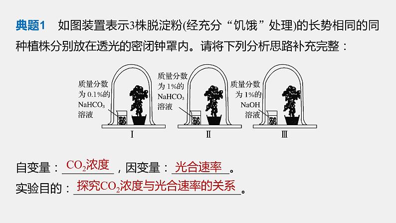 典题1 如图装置表示3株脱淀粉(经充分“饥饿”处理)的长势相同的同种植株分别放在透光的密闭钟罩内。请将下列分析思路补充完整: