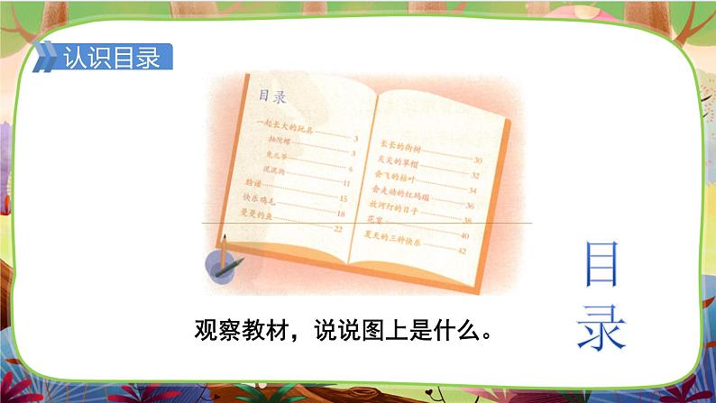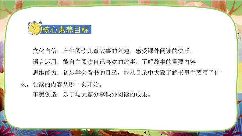 展开文化自信:产生阅读儿童故事的兴趣,感受课外阅读的快乐。 语言运用:能自主阅读自己喜欢的故事,了解故事的重要内容 思维能力:初步学会看书的目录,能从目录中大致了解书里主要写了什么,要读的内容从哪一页开始。 审美创造:乐于与大家分享课外阅读的成果。