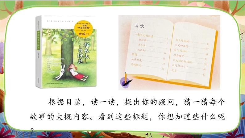 根据目录,读一读,提出你的疑问,猜一猜每个故事的大概内容。看到这些标题,你想知道些什么呢?
