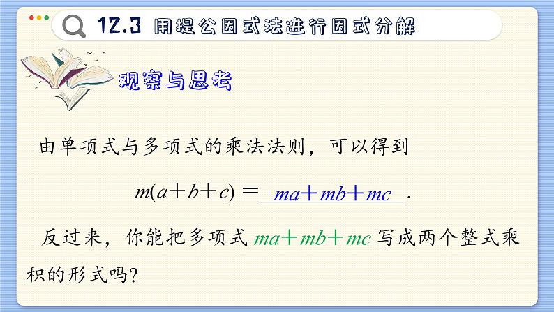 反过来,你能把多项式 ma+mb+mc 写成两个整式乘积的形式吗?