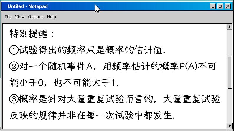 特别警示:①当选取多个样本时,估计总体概率等于几个样本频率的平均值;② 通过次数少的试验无法预测总体的概率,但每个结果在每次试验中发生的概率是可以预测的.