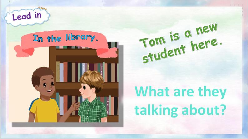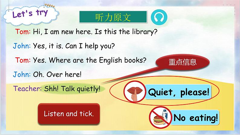 Tm: Hi, I am new here. Is this the library?Jhn: Yes, it is. Can I help yu? Tm: Yes. Where are the English bks?Jhn: Oh. Over here!Teacher: Shh! Talk quietly!