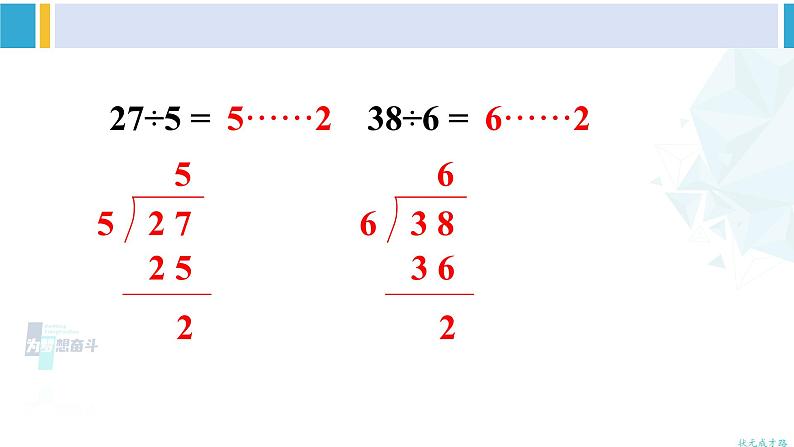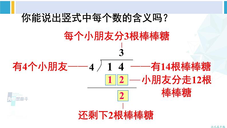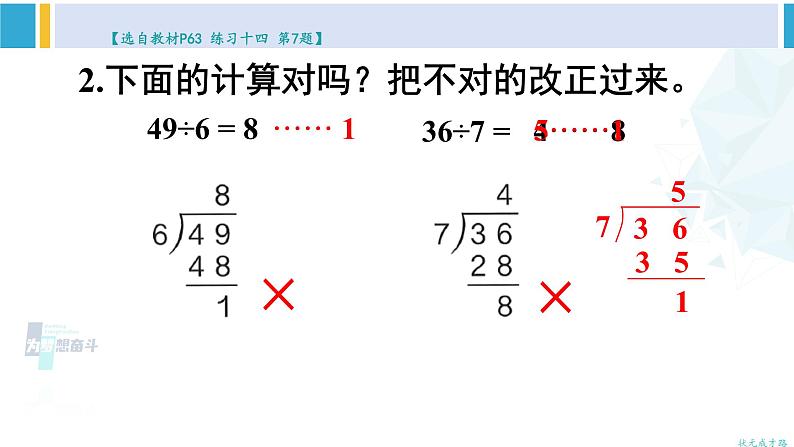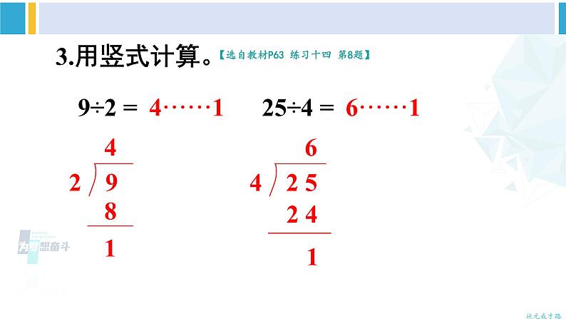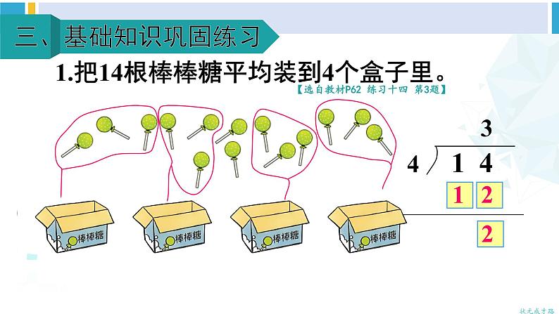 这是一份人教版6 余数的除法教学课件ppt,共22页。PPT课件主要包含了······1,里最大能填几,×6<57,×7<43,×4<31,×8<26,巩固试商技巧,基础知识巩固练习,有14根棒棒糖,有4个小朋友等内容,欢迎下载使用。
