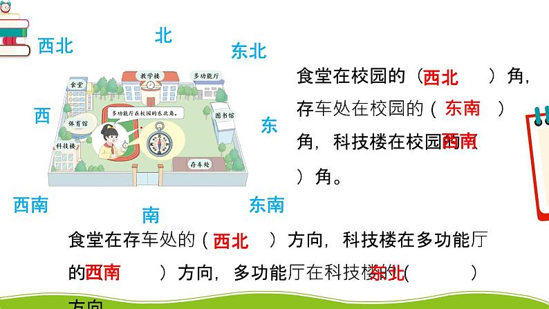 我们能辨认东、南、西、北、东北、东南、西北、西南八个方向,并能用这些方位词描述建筑物的位置。下课后,同学们可以到操场上找找四面八方都有哪些建筑物。回家后和爸爸、妈妈一起找一找你家客厅的四面八方各摆放着什么物品。
