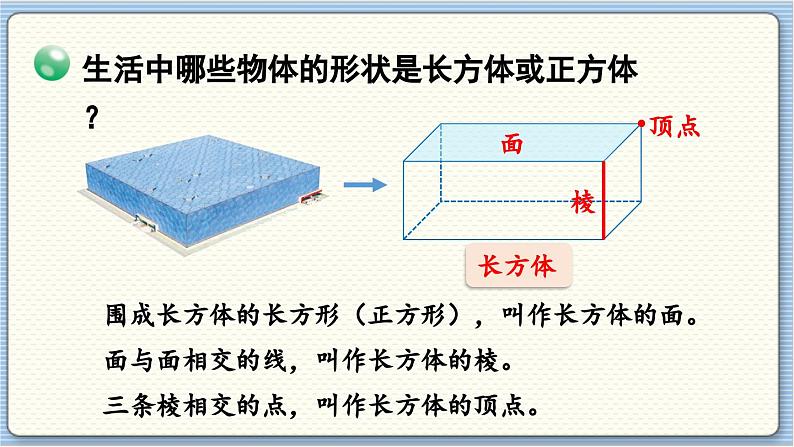 找一个形状是长方体或正方体的物品,并与同伴说一说它的顶点、面和棱。