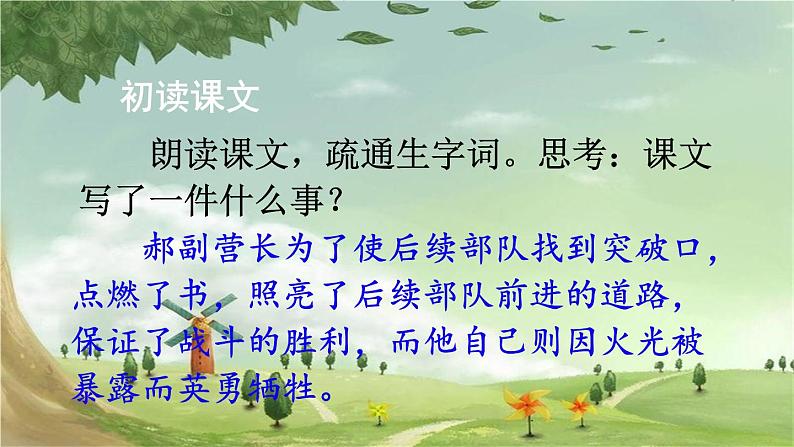 郝副营长为了使后续部队找到突破口,点燃了书,照亮了后续部队前进的道路,保证了战斗的胜利,而他自己则因火光被暴露而英勇牺牲。