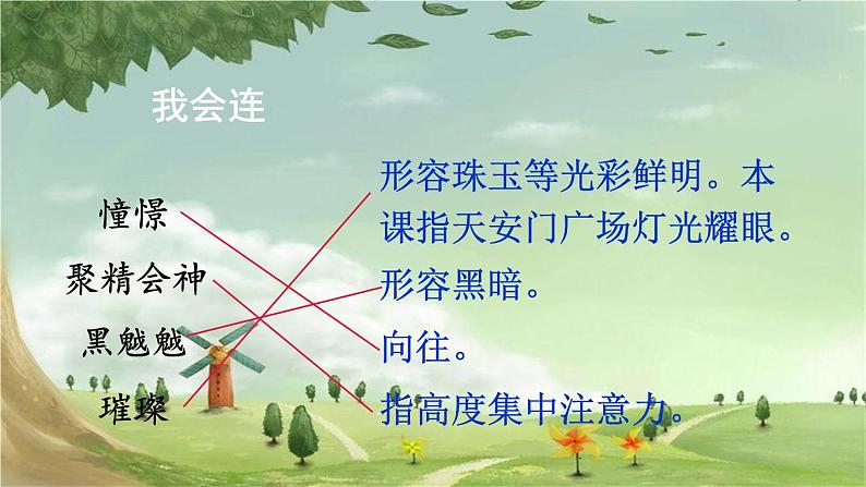 形容珠玉等光彩鲜明。本课指天安门广场灯光耀眼。