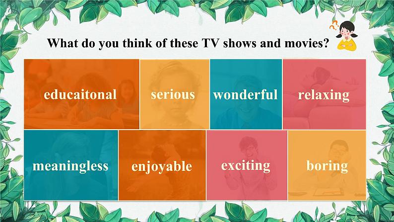 Key wrds & phrases:meaningless, actin, actin mvie, cartn, right nw, kinds f Key sentences: 1. Are there any gd mvies shwing right nw? 2. I want t watch smething relaxing, like a game shw r a sitcm. 3. I like t find ut what different peple think abut a subject.T learn t talk abut TV shws and mvies.