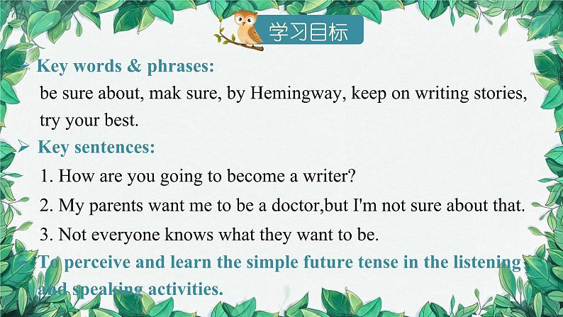 Key wrds & phrases: be sure abut, mak sure, by Hemingway, keep n writing stries, try yur best.Key sentences: 1. Hw are yu ging t becme a writer? 2. My parents want me t be a dctr,but I'm nt sure abut that. 3. Nt everyne knws what they want t be.T perceive and learn the simple future tense in the listening and speaking activities.