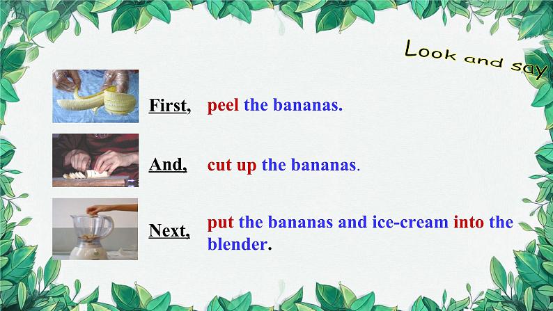 初中英语人教新目标 (Go for it) 版八年级上册Section A图片ppt课件: 这是一份初中英语人教新目标 (Go for it) 版八年级上册Section A图片ppt课件,共18页。PPT课件主要包含了新课引入,Peel,Cut up,Drink,Turn on,新课讲解,yogurt,bananas,honey,apples等内容,欢迎下载使用。