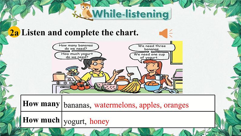 A: Let’s make fruit salad.B: OK, gd idea. Hw much ygurt d we need?A: One cup.B: Hw many apples d we need?A: Let me think… We need tw apples.B: OK, and hw much…