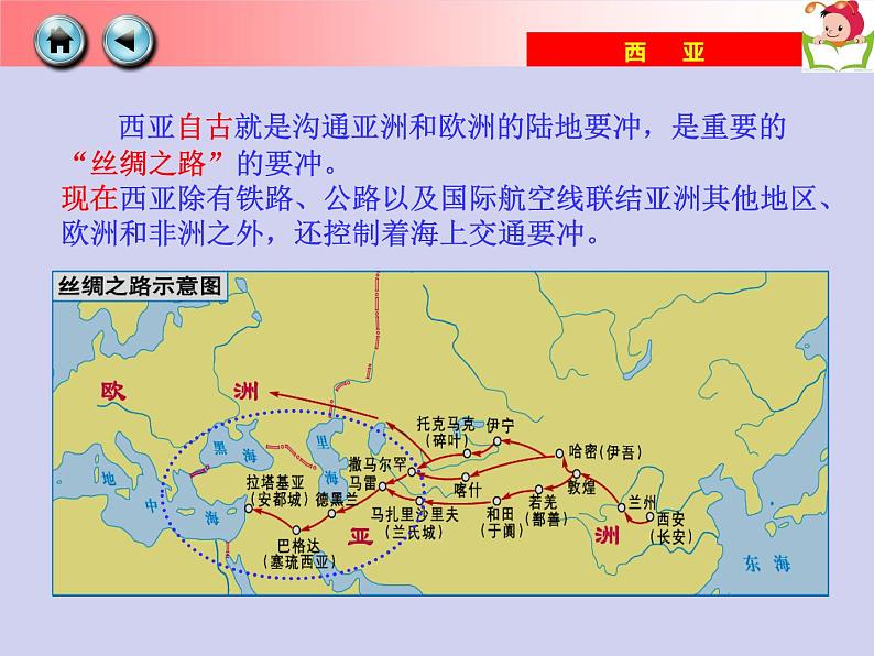 西亚自古就是沟通亚洲和欧洲的陆地要冲,是重要的“丝绸之路”的要冲。现在西亚除有铁路、公路以及国际航空线联结亚洲其他地区、欧洲和非洲之外,还控制着海上交通要冲。