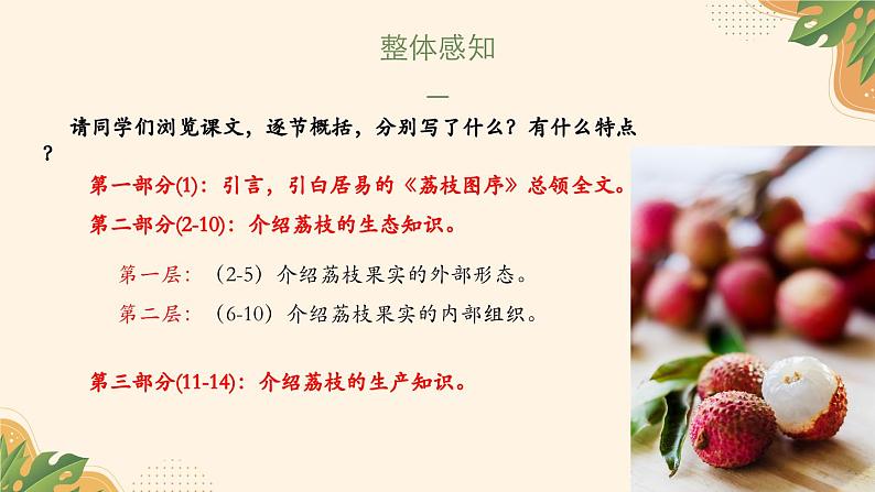 第一层:(2-5)介绍荔枝果实的外部形态。第二层:(6-10)介绍荔枝果实的内部组织。