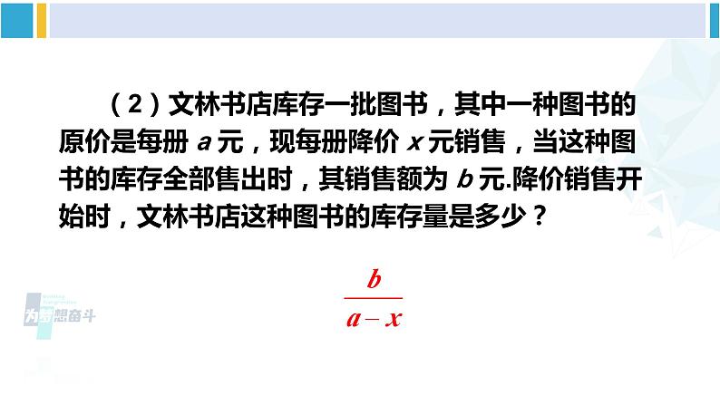 (2)文林书店库存一批图书,其中一种图书的原价是每册 a 元,现每册降价 x 元销售,当这种图书的库存全部售出时,其销售额为 b 元.降价销售开始时,文林书店这种图书的库存量是多少?